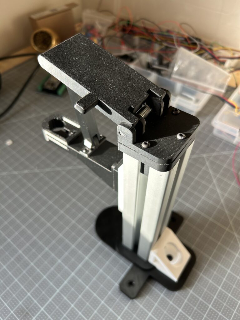 This is the newest design of the Heat Set Insert press with multiple improvements.To improve the accuracy and reliability, the previously 3D printed rail was swapped for a custom length T-Slotted piece of aluminum extrusion and linear bearing pad. A second improvement comes from the adjustable front clamp that holds the iron, by loosening or tightening the screw you can slide the clamp to easily remove or secure the iron. Another improvement came from replacing the exterior rubber bands with a coil spring that resits the movement and keeps the iron in a fixed position above the base when not in use.
